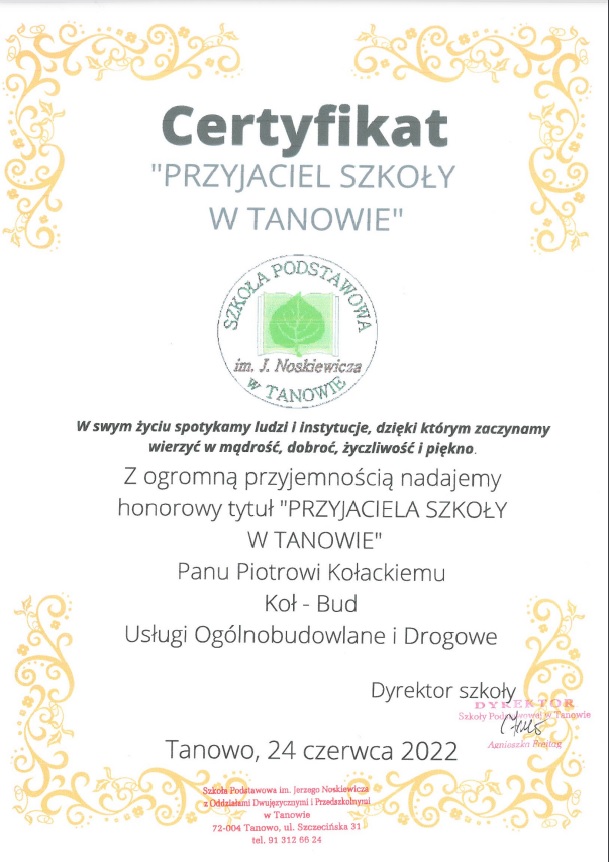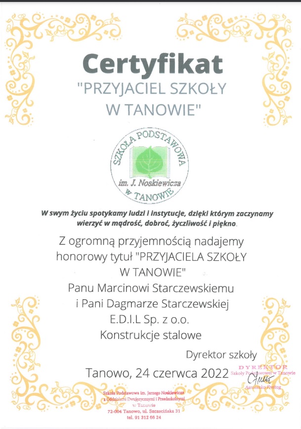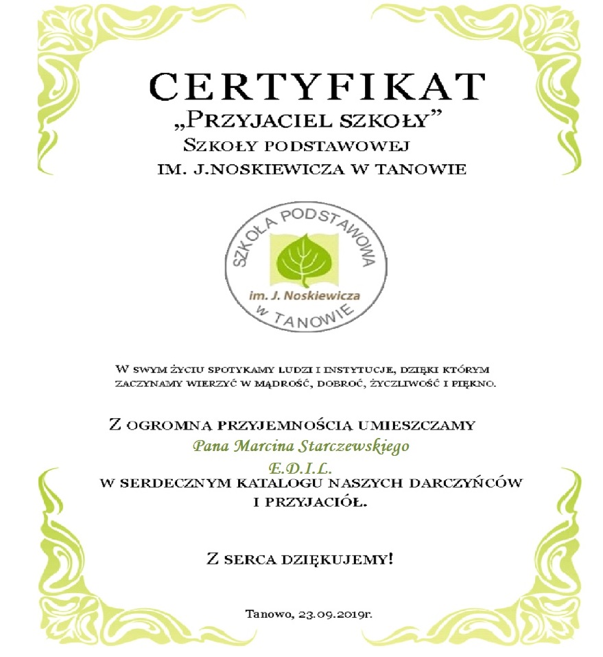 Dyrekcja, Grono Pedagogiczne oraz Uczniowie Szkoły Podstawowej im. Jerzego Noskiewicza w Tanowie składają serdeczne podziękowania za współpracę, okazaną pomoc, wsparcie i zaangażowanie w sprawy naszej szkoły.